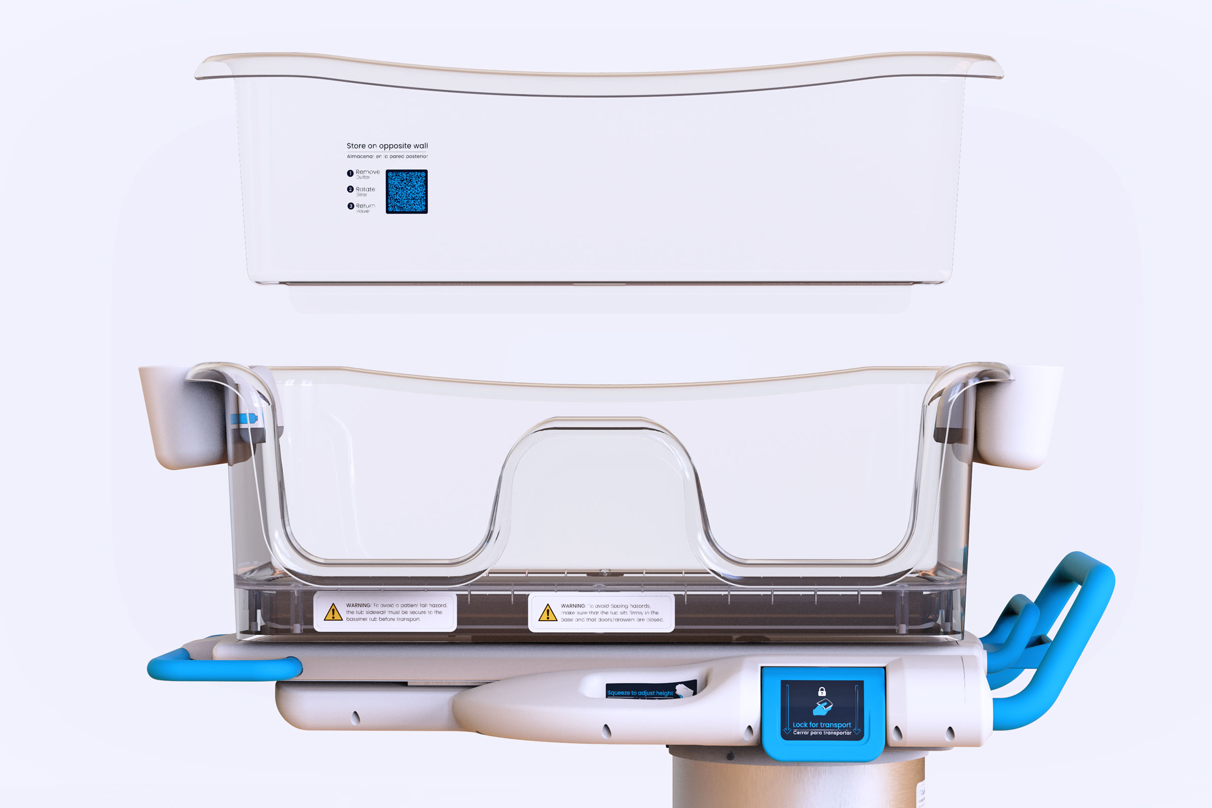Through three full prototyping cycles, the bassinet evolved from idea to refined product. Each iteration advanced key elements of the design, including an adjustable height that aligns with today’s low hospital beds, a rotating over-bed configuration that allows mothers to reach their infants safely, and a transparent tub that protects while keeping the newborn visible.
