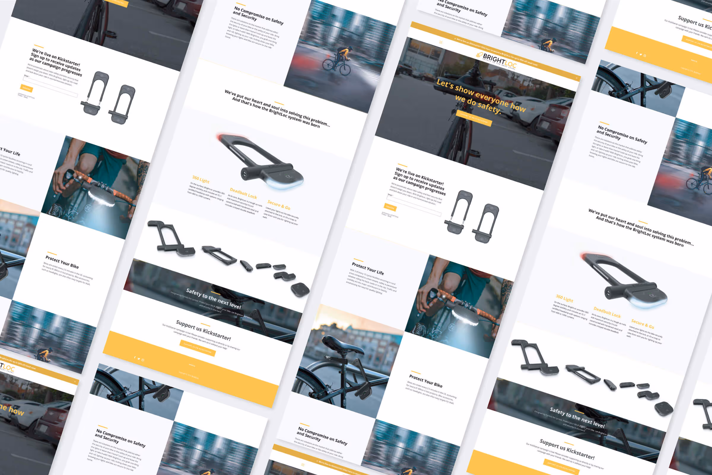 Creating a product that incorporates multiple removable accessories presented the challenge of designing BrighLoc to be effective and appealing in any situation. This meant designing a form that appeared “whole” when the lights were attached or when removed, such as for carrying or charging. This challenge was addressed through the design of complementary interlocking accessories that securely slide together, thus maintaining an aesthetic & symmetrical design while not detracting from the visuals of the bicycle itself. On top of brand identity development, we also created storyboards to better understand the consumer use-case to help solve the afromentioned challenges. Our team then designed a website for the announcement of the Kickstarter launch.