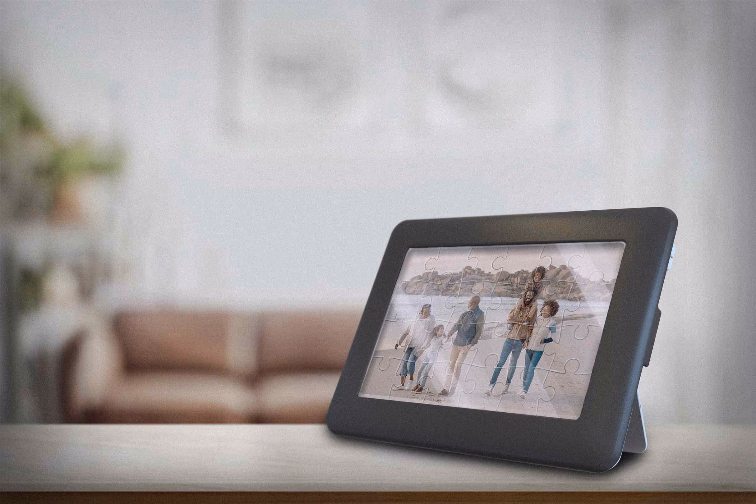 A Jigsawdio puzzle is not just your ordinary puzzle. It consists of a frame and acrylic puzzle pieces that are played on a soundframe. The pieces of the puzzle are personalized with images and audio stories that are specific to the individual with memory loss. Out of the pieces, six are "sound" pieces that light up and play recordings narrating the image associated with that part of the puzzle, making the experience more interactive and stimulating. Music and nostalgic songs, in particular, have been demonstrated to evoke delight among participants. After completing the puzzle, users can display it in their home by using a snap-on frame and a kickstand - essentially becoming a picture frame. While the puzzle is on display, users can engage with the playback feature that cycles through each audio recording all while keeping the frame on and the puzzle in place.