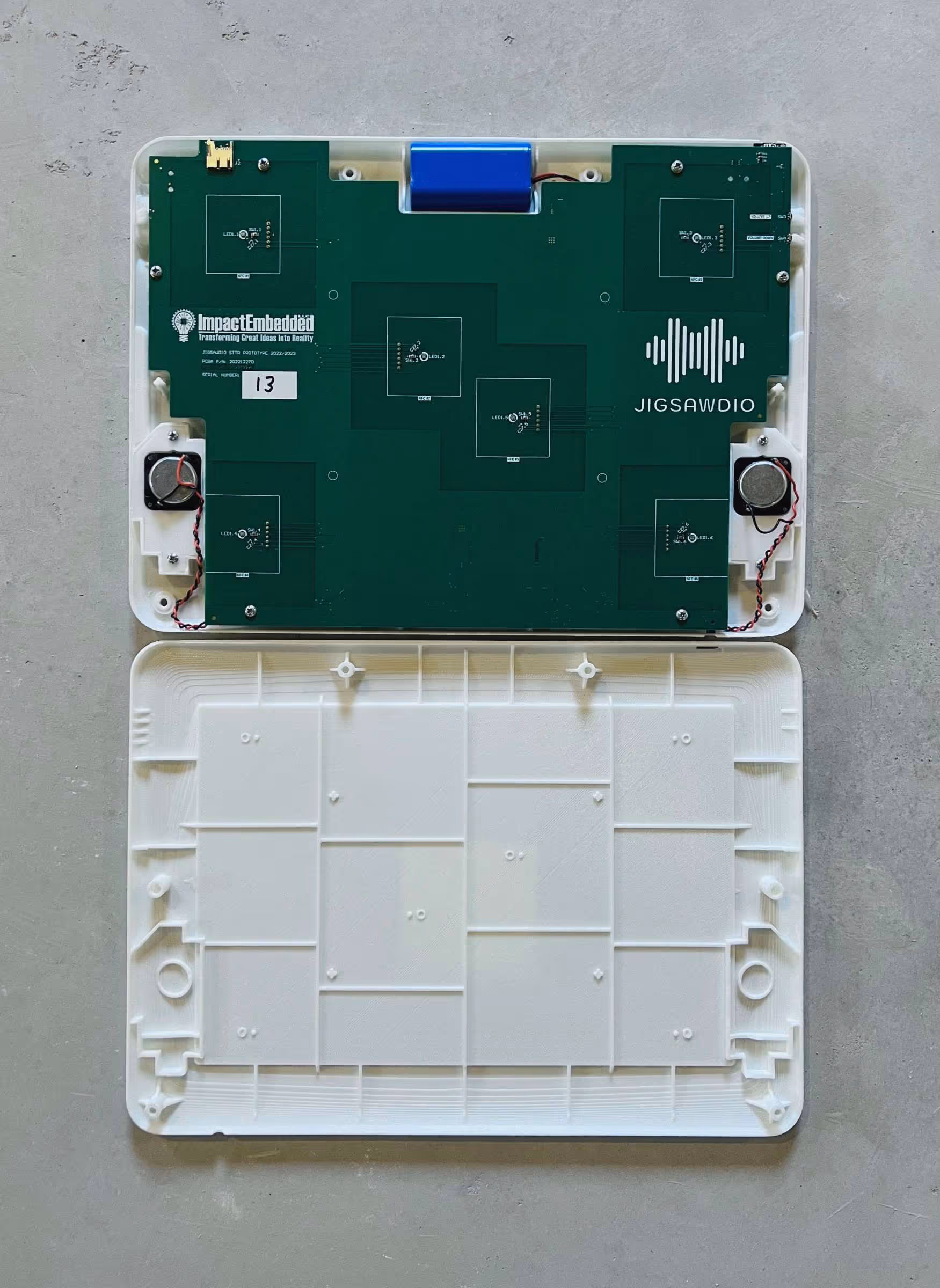 For assembly, Impact Embedded LLC provided the team with custom PCBs (printed circuit boards) and speakers to install into each device - adding the audiovisual magic to the puzzles. The PCBs were carefully installed within the enclosure to ensure proper connectivity between the buttons and audio recordings. Once all components were installed, the team tested each device to ensure that they were fully functional and ready for use by individuals with Alzheimer's disease and related dementias.
