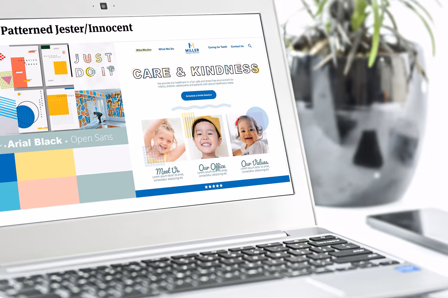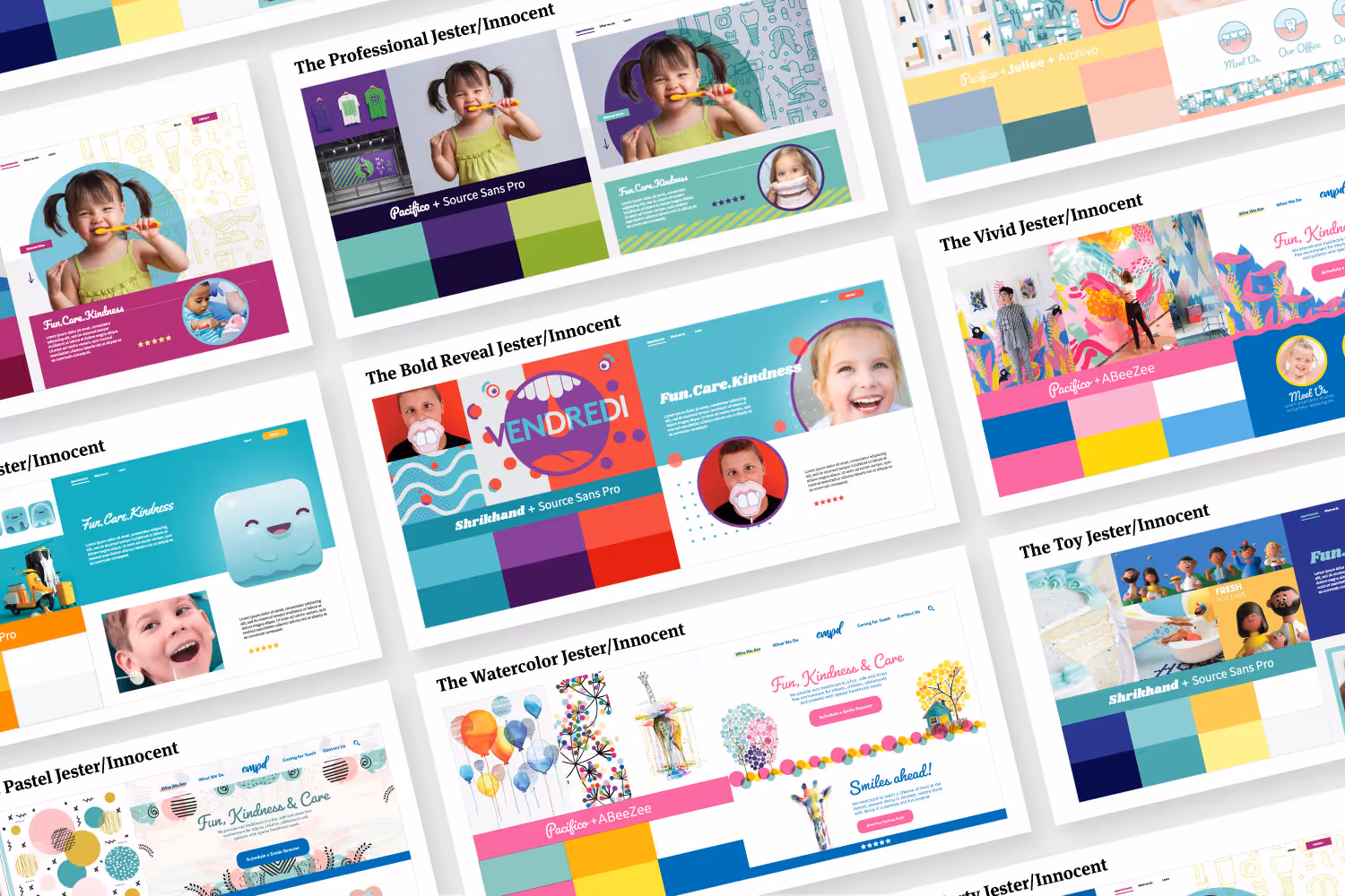 To capture a fuller picture, we also mapped out archetypes for the remaining competitor brands to gain insight into prevalent tonal and visual strategies. From here, we created a list of viable archetypes that would offer Dr. Miller’s brand a competitive edge and arrived at a Primary Jester with a secondary Innocent archetype set. The Jester, representing a playfulness in everything that it does, perfectly captures the ethos of Dr. Miller’s practice. By adding the secondary dimension of an Innocent as a tilt, we are able to also encapsulate a warm feeling of “striving for the ideal”—always looking to improve every patient experience and making sure to approach each patient with a sense of care and kindness. These archetypes would serve as the visual and tonal north star for the brand and would come to influence each piece of brand asset developed to ensure brand language consistency, building brand equity and strengthening brand loyalty.