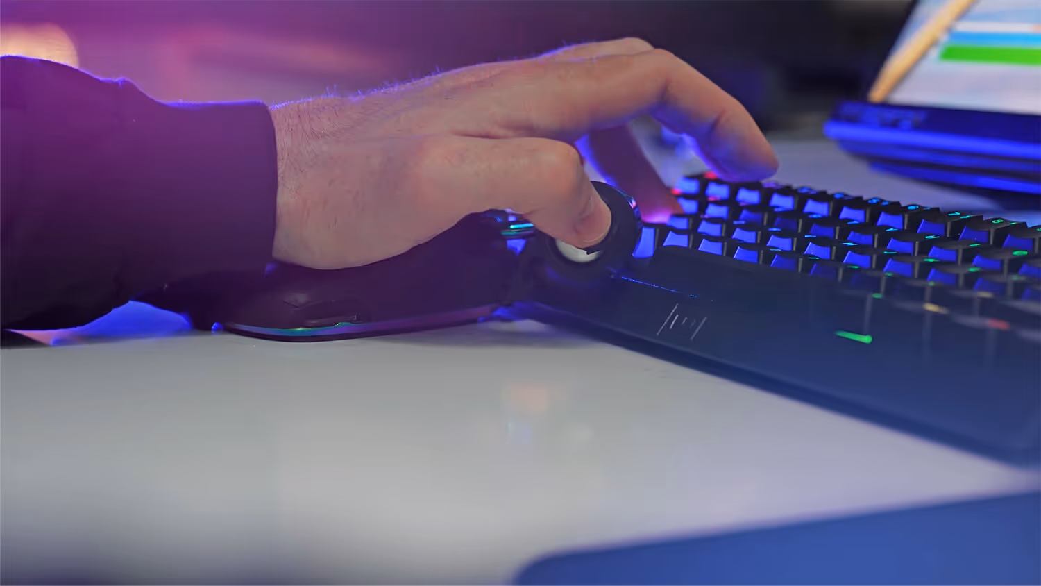 FPS (first person shooter) gaming requires extensive keybinds, so we positioned the Modke Mimic below the keyboard at an ideal height for comfortable key access. Custom keycaps for the Wooting 60HE keyboard (for initial launch) allows users to rotate the joystick into a perfect "claw" position, freeing up the keyboard for new techniques and play styles. It was named Mimic due to its bilateral symmetry, mirroring the ergonomic comfort of the opposite hand on a PC mouse, thus streamlining and enhancing movement.