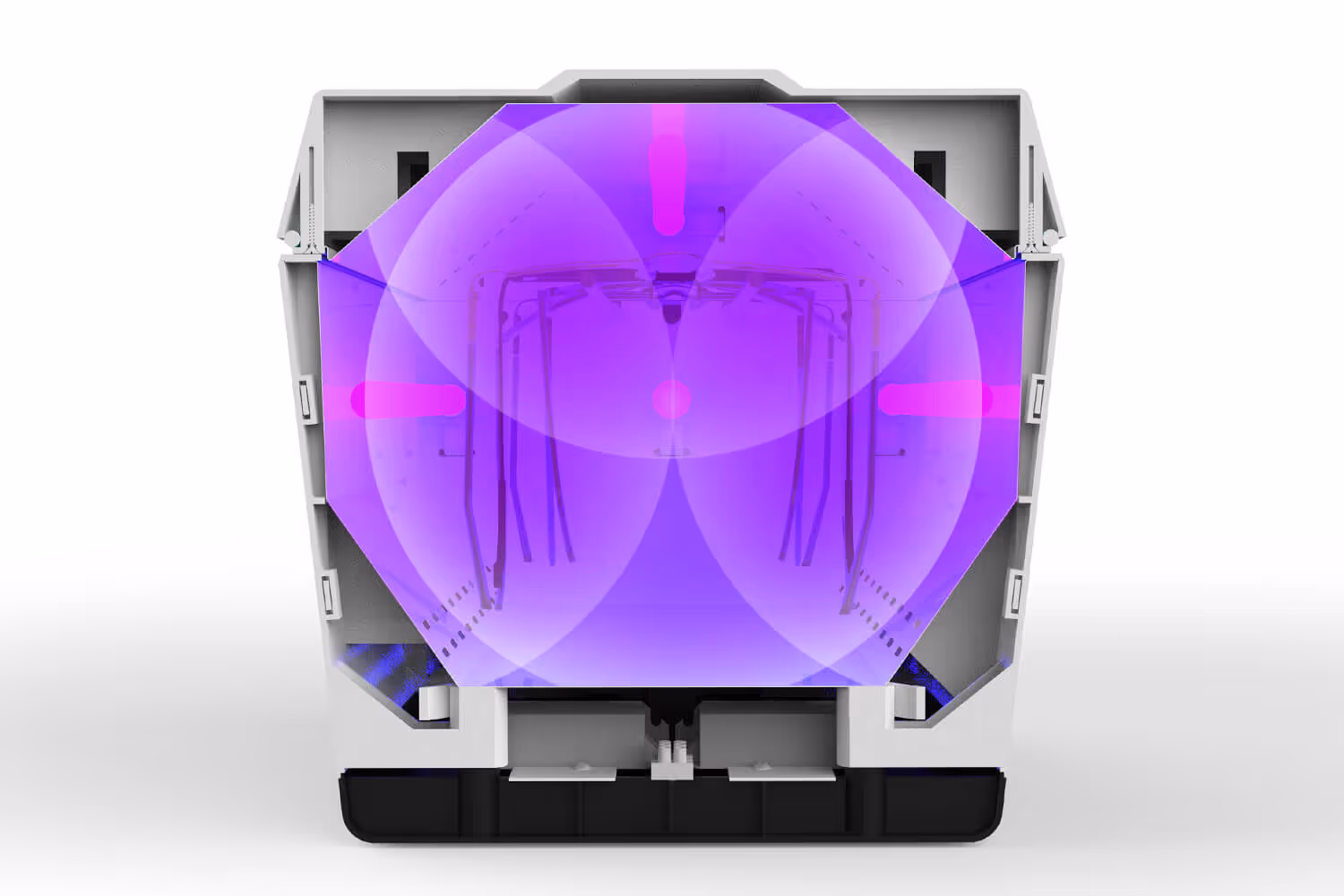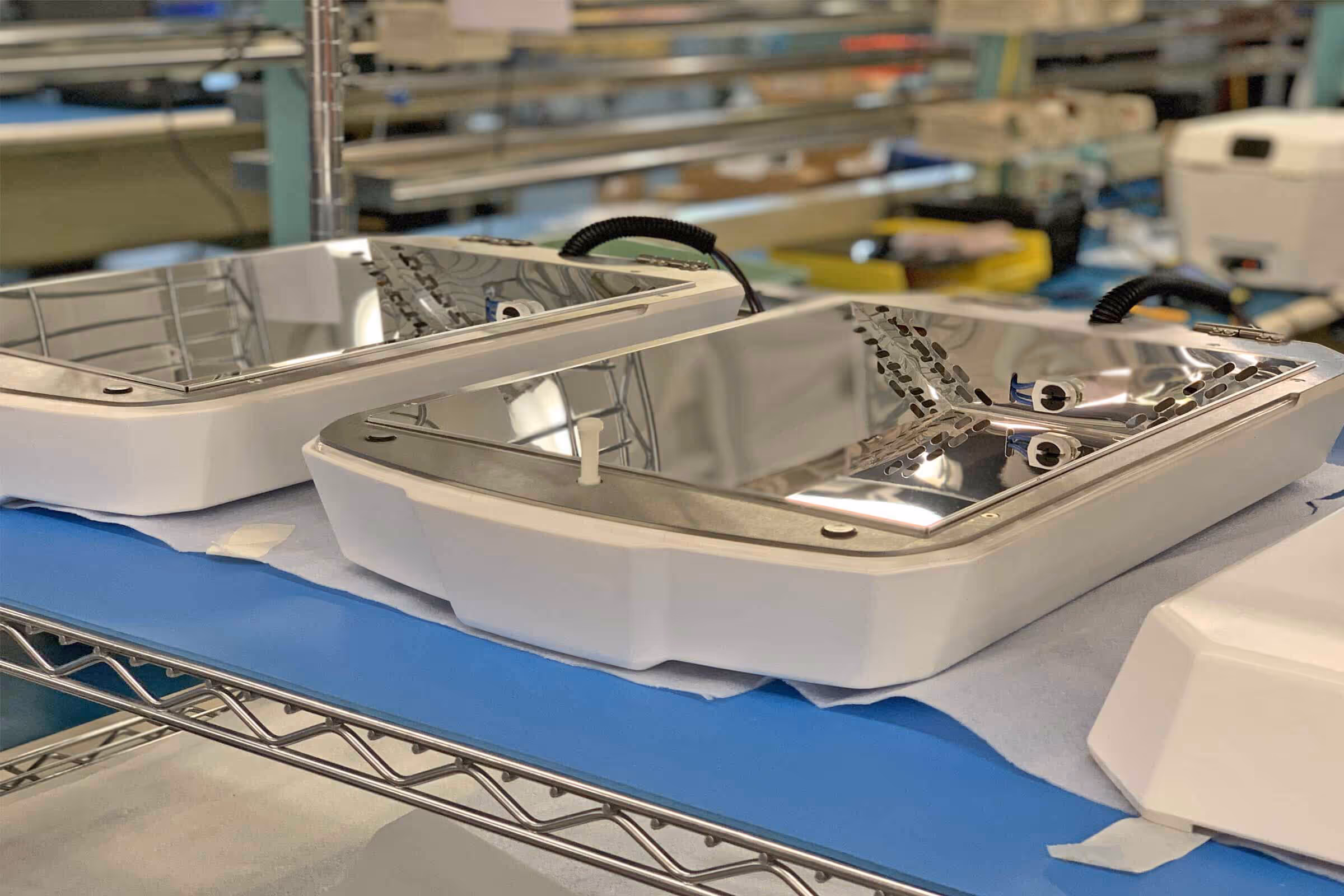Our partnership with Voxelight helped the process move quickly, due to their expertise and knowledge regarding UV light. They were able to focus on component sourcing and UV lamp requirements for sufficient disinfecting, which was necessary to pass independent testing for safety and efficacy. This freed up Trig to focus on the CAD development of the device enclosure to quickly produce 7 full scale prototypes for testing. After procuring the internal components and 3D printed parts for the full scale prototypes Trig met on site with Voxelight to observe and support with assembly. Valuable lessons learned during this process helped us to simplify assembly, more efficiently arrange internal components and re-design the enclosure for future servicing. In just weeks, we were on our way to producing another generation of CAD to be used for manufacturing.