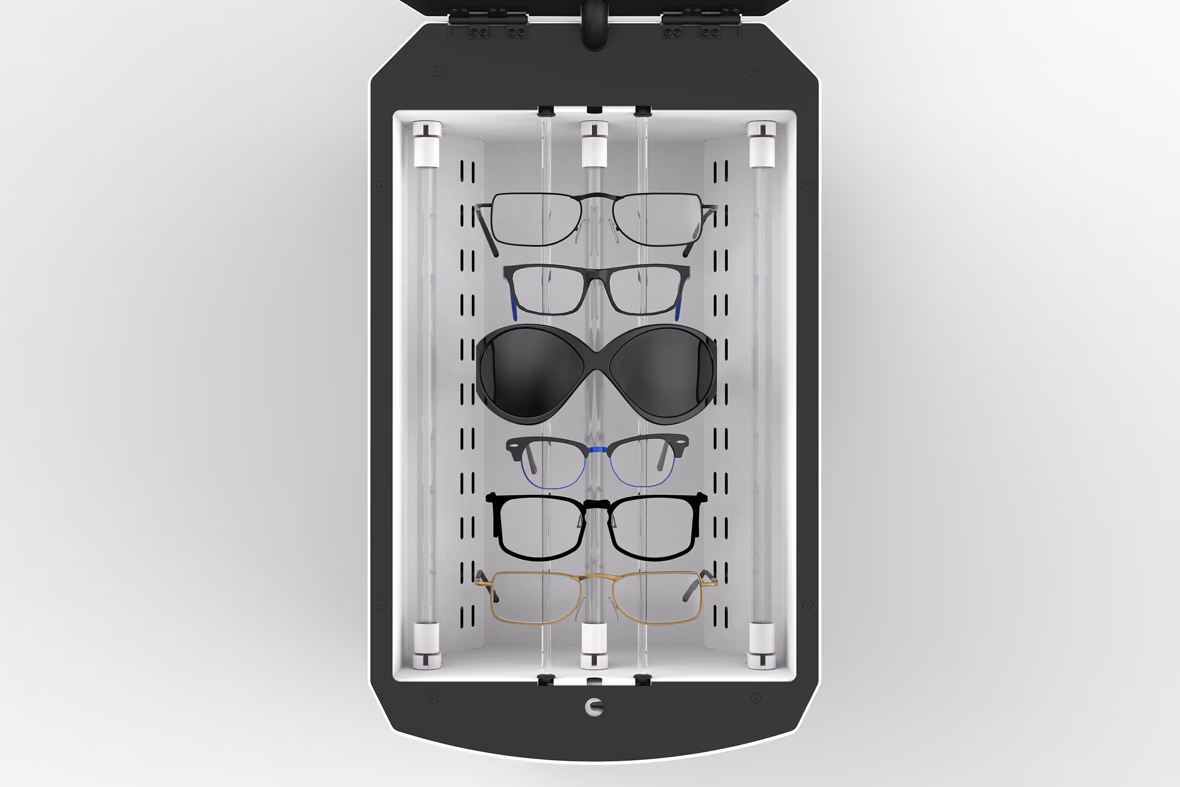 The recent pandemic has caused nearly every industry to evaluate their practices and make changes to better protect their employees and customers. Sometimes a small change is all it takes, while others have required more innovation to efficiently keep people healthy. The new awareness of easily transmissible germs and viruses has exposed challenges in the eyewear industry of serving numerous customers each day along with the plethora of frames and lenses being touched during visits. New standard practices require every single pair of frames to be set aside for extended periods of time until an employee becomes available to thoroughly disinfect them. This means a large amount of frame inventory is unavailable after each visit and productivity is consumed by manual cleaning of each frame – both validating the need for a fast and safe cleaning method to keep those frames available for the next customer.